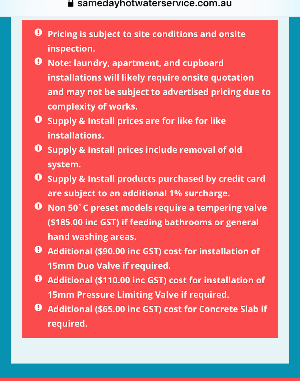 Click below to see what they Do Not Include but is listed at the bottom of their websites pages, required by QLD regulations and manufacture’s specifications
